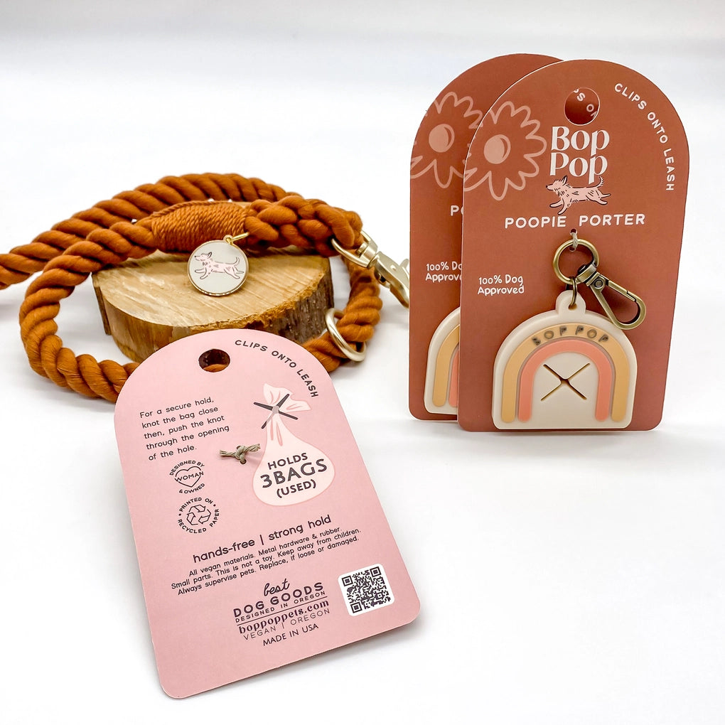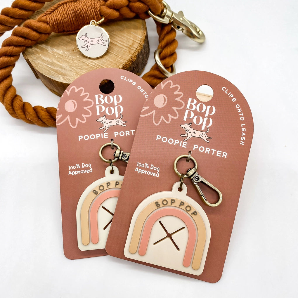 No more holding used dog poop bags! This original Bop Pop design is perfect for daily walks & strolls. Walk in boho style with this arch-shaped holder and brass clip.