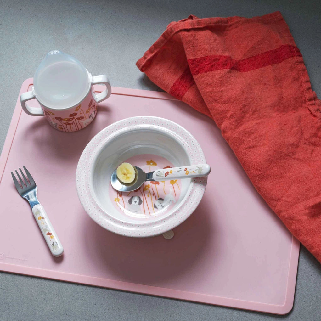 Bring your favorite four-footed furry friends & florals to mealtime at home and on-the-go with Puppies & Poppies. The convertible sippy cup starts with a lid to regulate flow, which can be removed to allow kids to drink or use as a snack container.